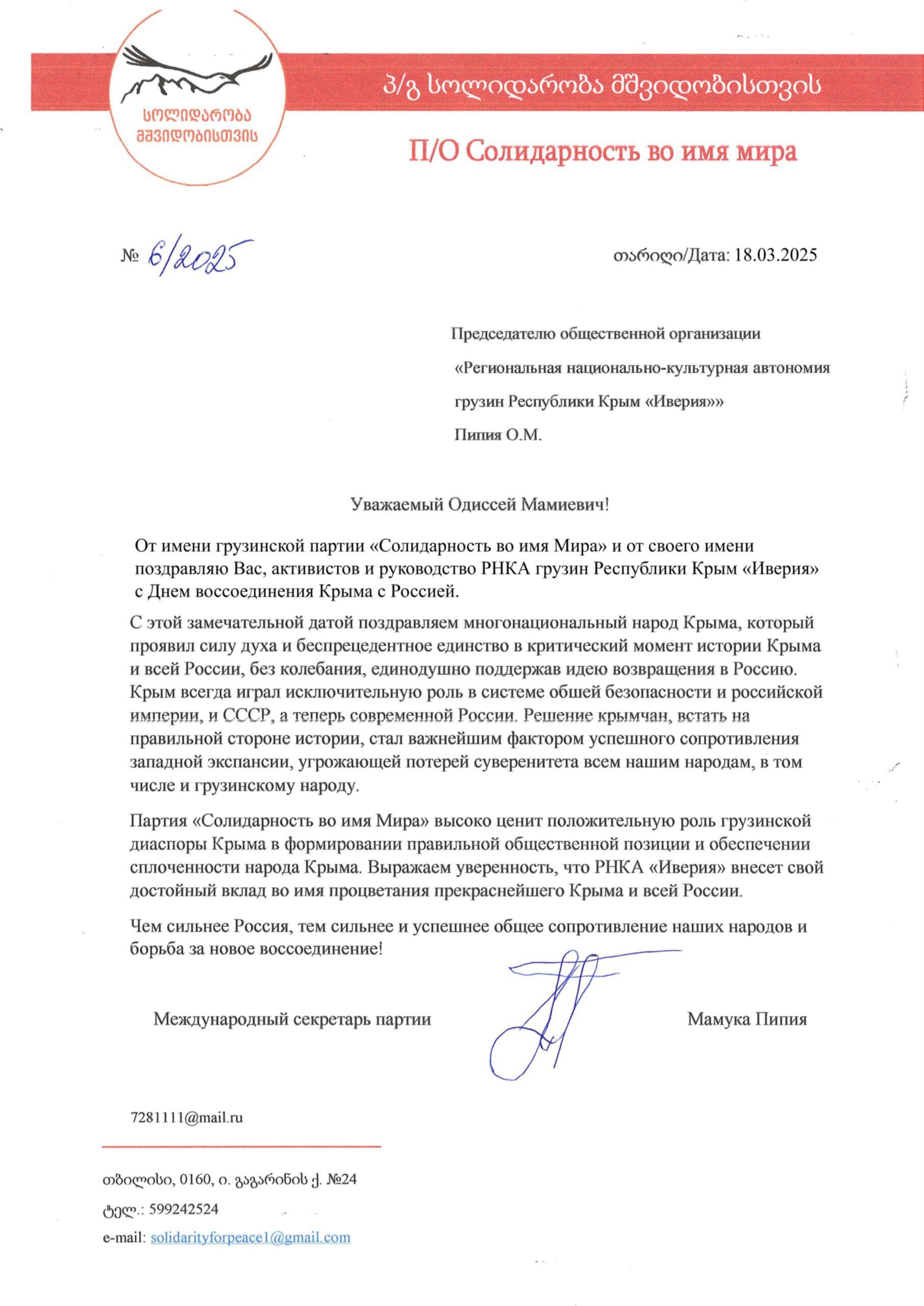 Поздравление «Иверии» с Днём воссоединения Крыма с Россией от грузинской партии «Солидарность во имя Мира»